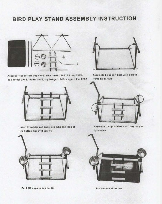 - Comes with: plastic dropping tray, bird activity/toy hanger and 2 food and water steel cups. Toy shown in photo for example only and not included.